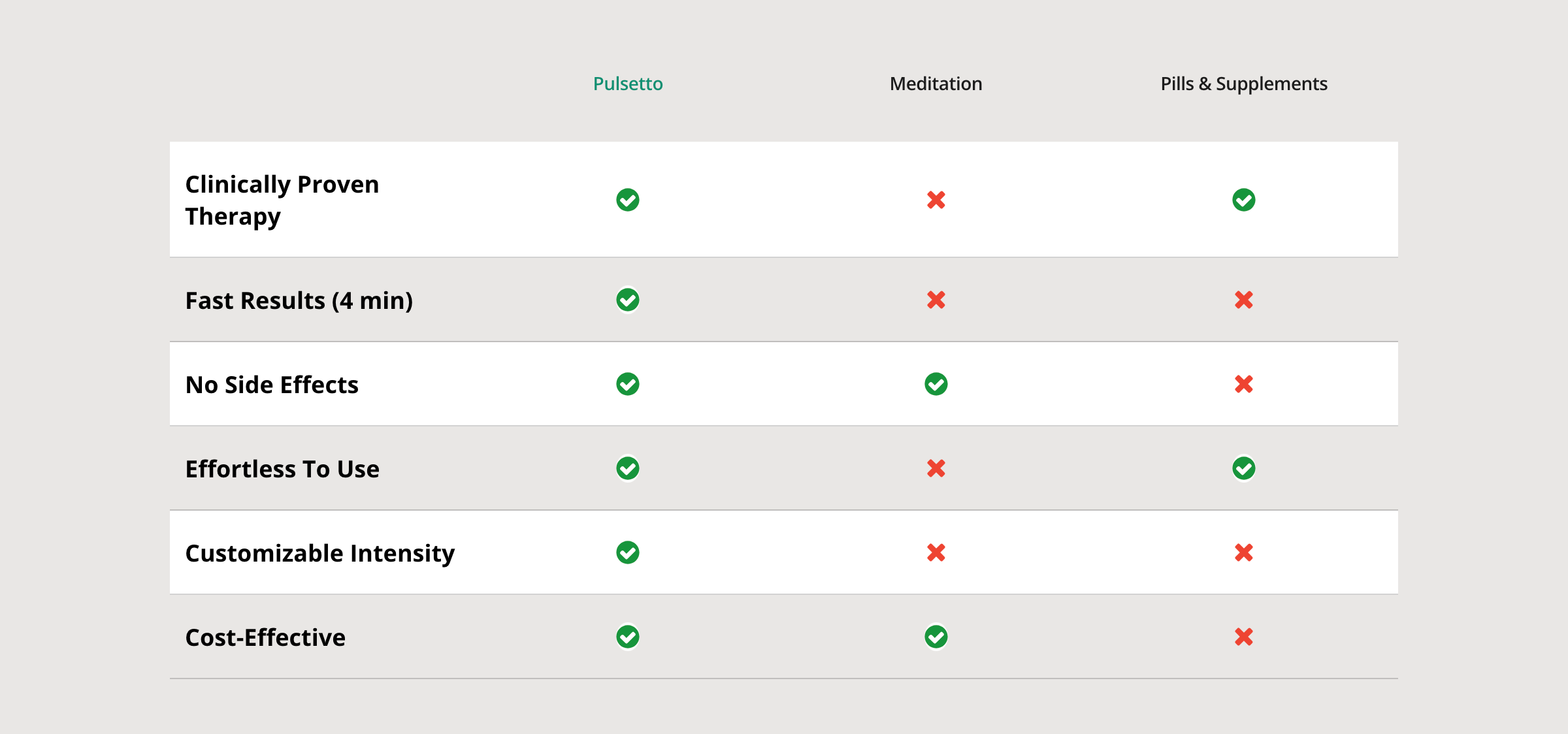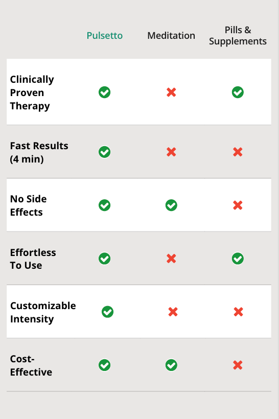 Meditation apps and supplements can help, but they often take time, focus, and commitment. Pulsetto works physically, not just mentally. By directly stimulating the vagus nerve, it taps into your nervous system’s core functions, creating a fast and reliable physiological shift. You don’t need to “get in the zone” or wait weeks for effects. It’s consistent, clinically supported, and easy to use daily. Pulsetto is not just a wellness tool, it’s a nervous system upgrade.