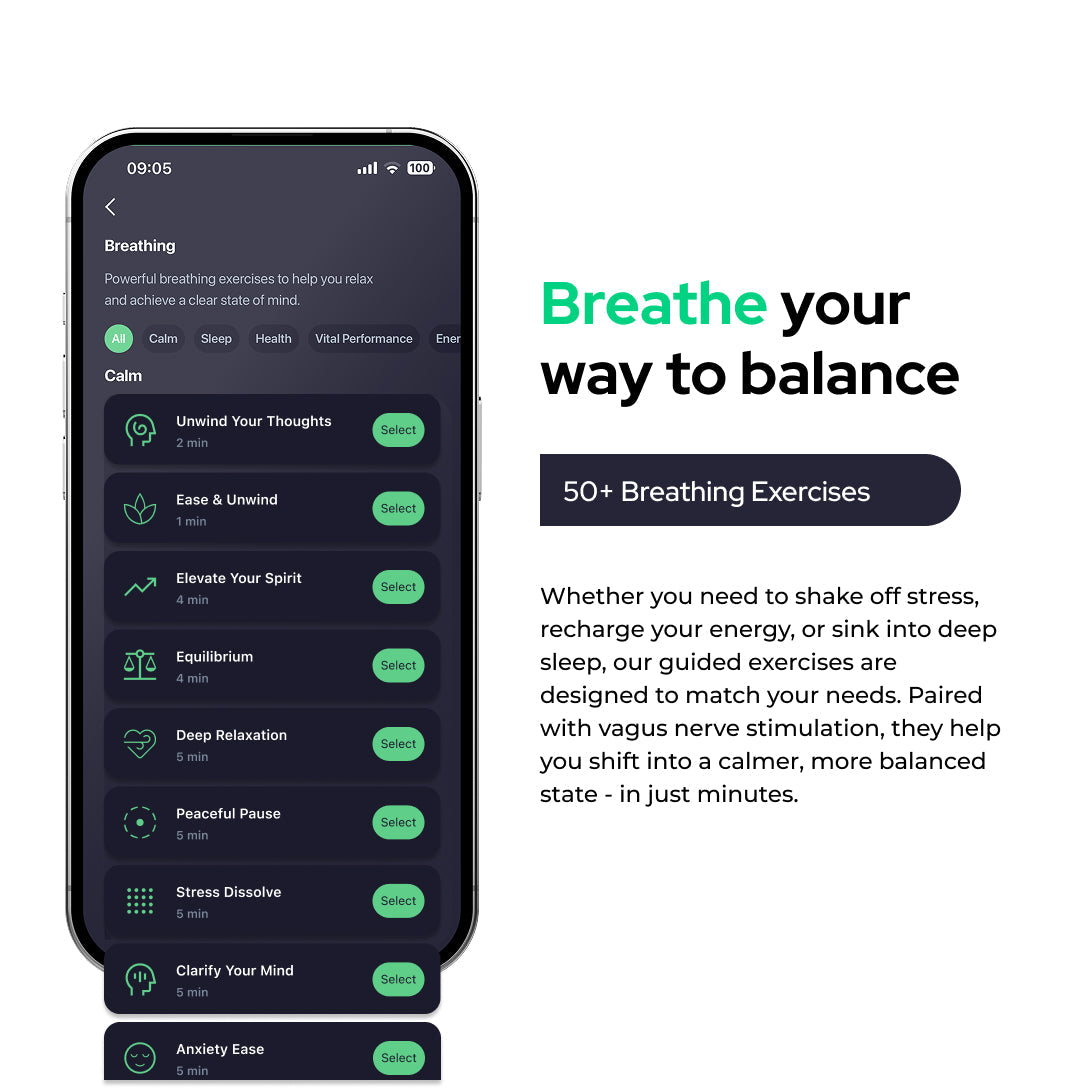 Your breath is your superpower. Whether you need to shake off stress, recharge your energy, or sink into deep sleep, our guided exercises are designed to match your needs. Paired with vagus nerve stimulation, they help you shift into a calmer, more balanced state - in just minutes.